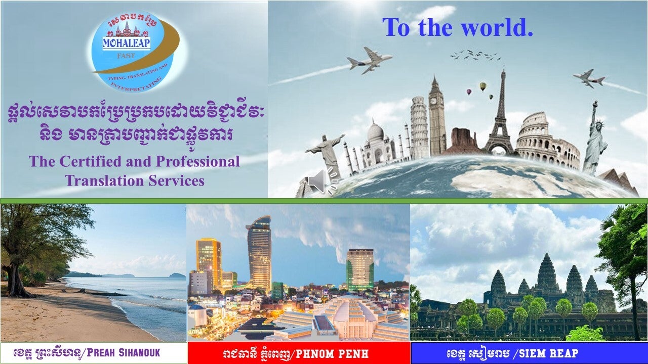 ក្រុមហ៊ុនសេវាបកប្រែភាសា មហាលាភ ហ្វាស់ -MOHALEAP FAST TRANSLATION COMOPANY is a leading translation and interpretation company based in Phnom Penh, Cambodia. We are dedicated to providing accurate, reliable, and culturally sensitive language solutions to businesses and individuals alike. Our commitment to excellence ensures that your message is effectively conveyed to your target audience.