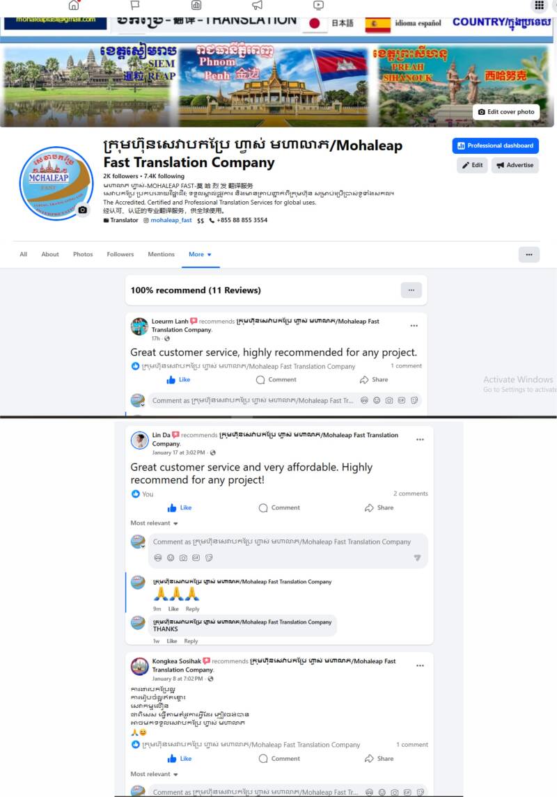 Read reviews and comments from our clients on social media and our website. Discover why clients around the globe choose ក្រុមហ៊ុនសេវាបកប្រែភាសា មហាលាភ ហ្វាស់ -MOHALEAP FAST TRANSLATION COMOPANY for accurate and fast translation services.