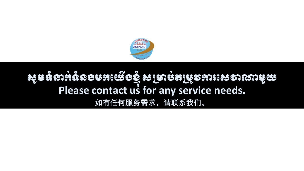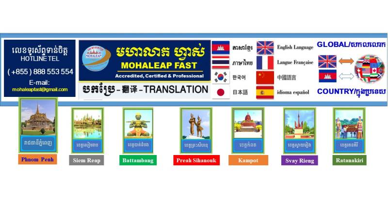Need an accurate translation, fast service, and a good price? Contact ក្រុមហ៊ុនសេវាបកប្រែភាសា មហាលាភ ហ្វាស់ -MOHALEAP FAST TRANSLATION COMOPANY today! We offer prompt replies and are available 24 hours a day. Let us know how we can assist you with your translation and interpretation needs.
